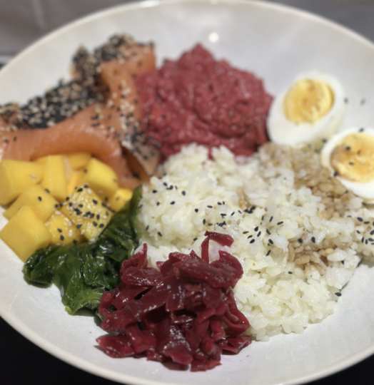 6. Adding 120g of salmon to each portion, Tbsp of Sauerkraut, 74 grams of diced mangos, 1 boiled egg, tbsp of soy sauce over the rice, 115g of beetroot hummus, tsp of sesame seeds sprinkled over & a tsp of dried seaweed.