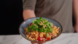 Kook de rijst en voeg het bouillonblokje en de appelazijn toe. Zorg ervoor dat het bouillonblokje goed gemengd is en zet de rijst apart als hij gaar is. 2. Kook...