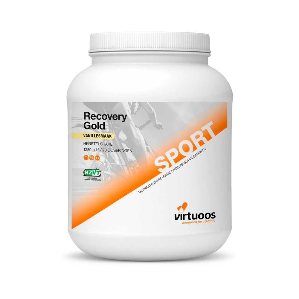 Stimuleer jouw herstel na het sporten met Recovery Gold. Deze complete herstel shake helpt om snel eiwitten, koolhydraten en vocht aan te vullen na een training of wedstrijd. Een shake levert 35 g koolhydraten (2:1 glucose:fructose) en 24 g eiwitten (waarvan 3 g leucine en 6,7 g BCAA’s).